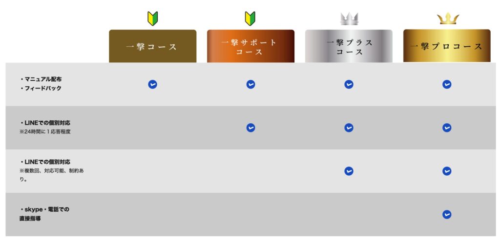 内容から見て、投資初心者さんが利益を出すには、最低でも「一撃プラスコース」を受講しなければ成果に繋げるのは難しいと感じます。