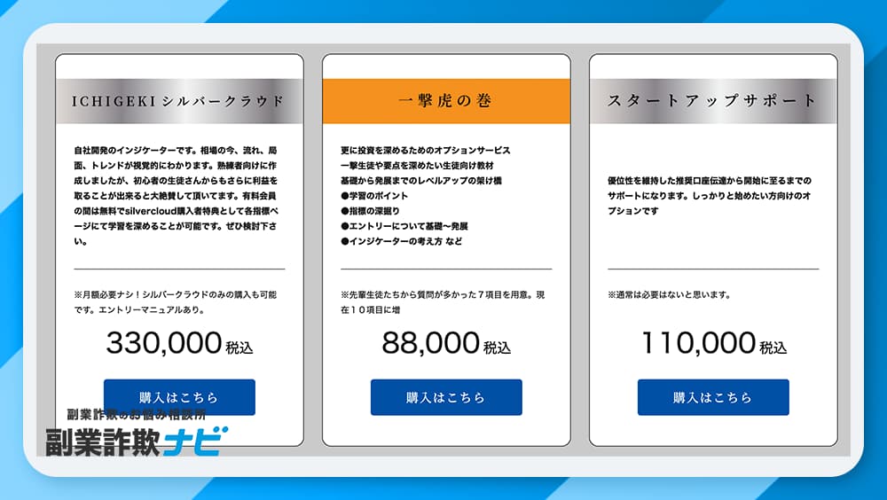 さらにオプションサービスとして、独自インジケーター(33万円)、投資教材(8.8万円)、スタートアップサポート(11万円)なども販売されています。
