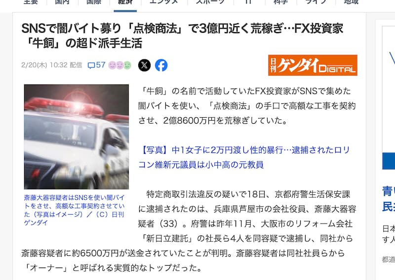 斎藤容疑者はSNSで「稼げる投資家」として集客し、裏では闇バイトを使い「点検商法」で高額工事を契約させる詐欺を行い、2億8600万円を荒稼ぎしていたとされています。