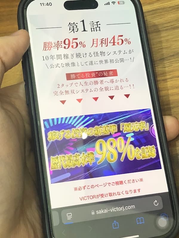 VICTORは、坂井彰吾という人物が開発したトレードシステムです。AIが完全自動で稼ぐEAによってスマホ2タップで100万円単位の利益を実現しており、勝率95%・月利45%の10年間稼ぎ続けている怪物システムとのこと。