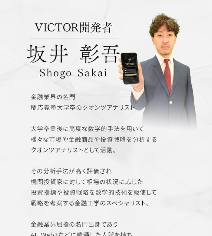 VICTORの開発者・発起人として紹介されている坂井彰吾についても調査しましたが、投資家としての具体的な実績は確認できませんでした。