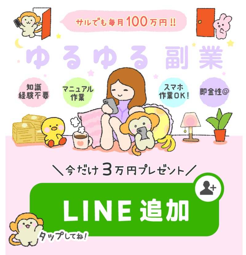 ゆるゆる副業は、LINE登録をするだけで「サルでも毎月100万円!」が実現できると謳われていますが、