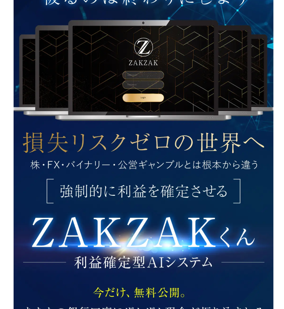 ザクザクくん(ZAKZAKくん)とは、「損失リスクゼロ」「強制的に利益を確定させる」と謳う副業AIシステム案件です。公式LPでは、まるで誰でもノーリスクでお金が増えるかのような印象を与える言葉が並んでいます。