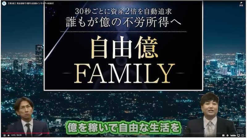 最終的には、自由億FAMILYというオンラインコミュニティに入会することで、専用システムの利権がもえらる流れだったのですが、20万円以上の入会金を支払うメリットは低いでしょう。