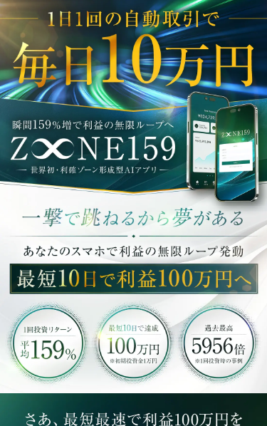 ZONE159(ゾーン159)は、出資者に対して毎日10万円を狙えるという誇大広告が目立つAI取引アプリです。